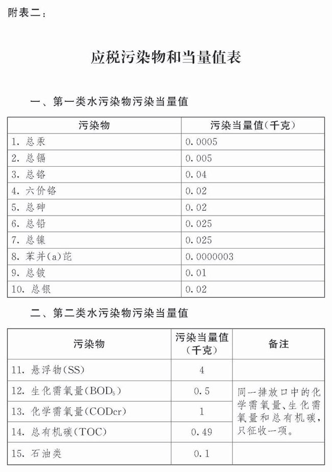 第八條 應稅大氣污染物、水污染物的污染當量數(shù),以該污染物的排放量除以該污染物的污染當量值計算。每種應稅大氣污染物、水污染物的具體污染當量值,依照本法所附《應稅污染物和當量值表》執(zhí)行。